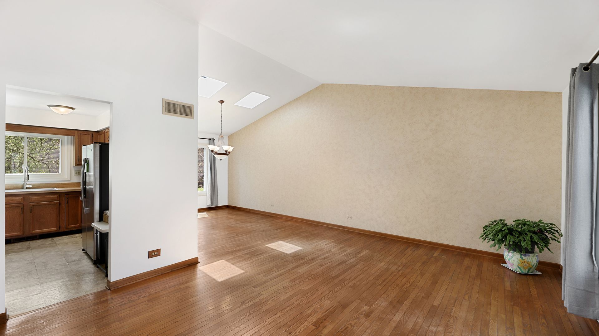 Welcome to this lovely split level home with 3 levels of above ground living space and a full English basement. Cathedral ceiling Living room and Dinning room with 2 skylights. Beautiful hard wood floor in living room, dinning room, family room, and 3 bed rooms. Master bed room with ceiling fan. Spacious Family room with fireplace and sliding glass door to the custom brick patio. Big backyard with mature trees. Basement with a Den and look out window. There are updates through out the years: *** vinyl windows (12/2008), *** Roof (2020), *** vinyl siding (2021 appr.), ***heating (2021), *** Air conditioner (2023), *** Oven/Range (11/2025). ***Fresh painted (2026) except the west wall in living/dining rooms.