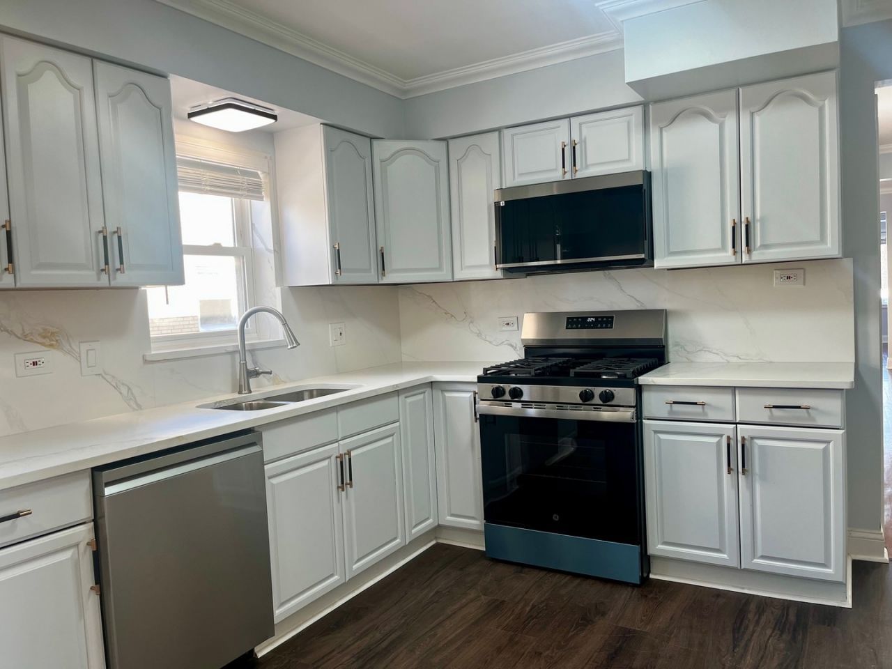 Completely renovated 3-bedroom, 1.5-bath home in prime Lincolnwood location offering 1,400 square feet of move-in ready living space. This top-to-bottom renovation features a brand new kitchen with white cabinetry, marble-look quartz counters and backsplash, and full stainless steel appliance package. The updated bathroom showcases custom tile work with designer fixtures throughout. Beautiful hardwood floors flow through the open living and dining areas, complemented by crown molding and modern ceiling fans. Three generous bedrooms provide flexibility for families or roommates, with excellent natural light in every room. The enclosed balcony offers additional space - perfect for a workout area, or year-round relaxation spot. Practical amenities include optional off street parking on-site and free laundry in the building. Central Air and Heat. Located in a residential neighborhood with easy access to Chicago, shopping, and parks. This completely refreshed home is ready for immediate occupancy - nothing to do but move in.