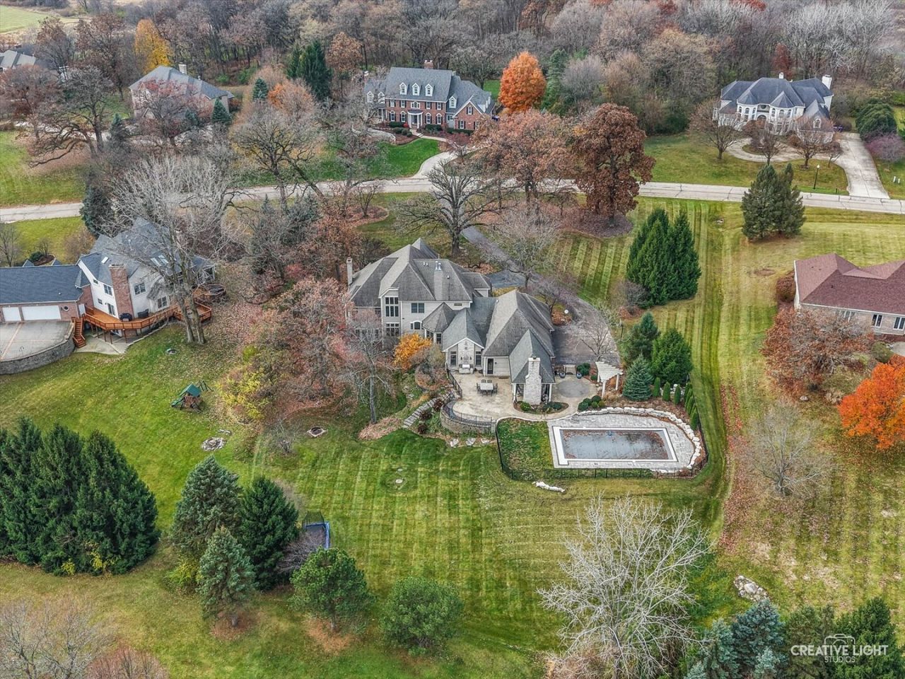 Resort-style living meets timeless elegance in this extraordinary custom estate, surrounded by mature trees and beautifully redesigned landscaping. A dramatic two-story foyer with marble flooring, architectural columns, and soaring ceilings creates a stunning first impression, while expansive windows throughout the home fill the interior with natural light and peaceful views of the surrounding grounds. The thoughtfully designed layout showcases rich hardwood flooring, detailed millwork, and expansive living spaces ideal for both everyday living and entertaining. The impressive great room features soaring coffered ceilings and a striking stone fireplace, flowing seamlessly into the chef's kitchen with granite countertops, custom cabinetry, stainless steel appliances, an oversized island with wine storage, and a sun-filled breakfast area framed by windows. A distinguished executive office with a fireplace and custom built-ins offers the perfect work-from-home retreat, while the desirable first-floor owner's suite provides a private sanctuary with a spa-inspired bath featuring dual vanities, a whirlpool tub, and an oversized walk-in shower. The well-appointed laundry room adds convenience and functionality with a dedicated pet bath, perfect for keeping four-legged family members clean after outdoor adventures. The expansive finished lower level is designed for recreation and entertaining, complete with a custom wet bar, generous gathering spaces, a fitness room, guest bedroom, and bath. Step outside to your private backyard oasis featuring a luxury in-ground pool (2021), expansive patio, and an inviting outdoor fireplace-perfect for relaxing evenings or entertaining under the stars. Professionally redesigned landscaping surrounds the space, creating a peaceful wooded retreat. Ideally located near shopping, dining, parks, golf courses, and highly rated schools, this exceptional residence offers the perfect balance of privacy, elegance, and convenience.