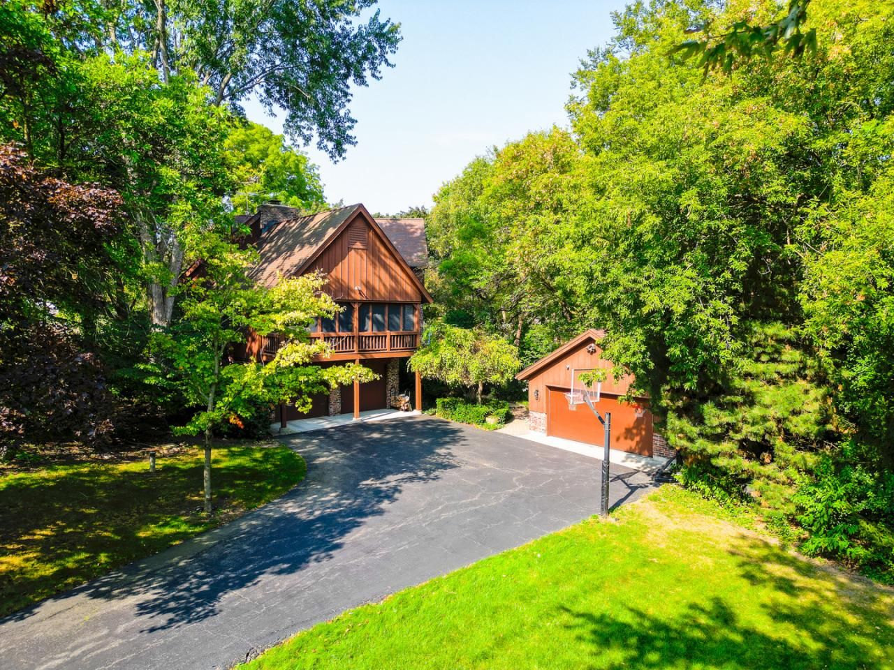 Welcome to this hidden gem, where the charm of a luxurious resort meets the comfort of home. Nestled away from the street's view, this extraordinary cabin-inspired property is set on a sprawling 3/4-acre lot adorned with 40 majestic mature trees, creating a serene and private sanctuary that overlooks a tranquil pond. As you step into the backyard, you'll find a spectacular outdoor oasis designed for both relaxation and entertainment. Dive into the refreshing waters of the 30-foot in-ground pool, complete with a thrilling waterslide and a soothing waterfall. Wander along private pathways that meander through lush foliage to the pond, or host unforgettable gatherings on the expansive two-tiered wood deck featuring built-in seating, all shaded by the grandeur of towering trees. Inside, this unique A-frame home is a masterpiece of custom craftsmanship and rustic elegance. The great room welcomes you with its soaring exposed wood beams, a slatted wood ceiling, and exquisite millwork, all centered around a striking two-story stacked klinker brick wood-burning fireplace that invites cozy evenings. Step out onto the full-screened porch, where ceiling fans create a gentle breeze, making it the perfect spot for morning coffee or evening cocktails while you soak in the serene views and enjoy the sounds of nature. The dining room is a sunlit haven, boasting stunning views through skylights and a wall of windows that bring the outdoors in. The heart of the home, the kitchen, features a generous center island, gleaming granite countertops, and beautiful custom wood cabinetry, making it a culinary delight for any home chef. The main level also includes a charming cabin-inspired bedroom with half-log walls and a wood-slat ceiling, a spacious office complete with a fireplace and French doors leading to the poolside deck, and a full bath showcasing a beautiful stone shower. A large laundry room with ample counter space and storage enhances the home's functionality. Ascend to the lofted two-level primary bedroom, a tranquil retreat that offers a granite tile shower, a luxurious two-person Jacuzzi tub, a walk-in closet, and a cozy sitting room with picturesque views. Two additional spacious bedrooms and a full bath with a Jacuzzi tub/shower complete the upper level, providing ample space for family and guests. The finished basement offers a versatile recreation space, a workout room, and additional storage, along with access to the attached two-car garage. An additional detached 2.5-car garage with a full attic provides the perfect solution for extra vehicles or hobbies. Quietly situated yet conveniently close to highways (294 & 53), Metra, shopping, dining, and more, this property is not just a home; it's a resort-like escape waiting for you to call your own. Welcome to your one-of-a-kind private haven!